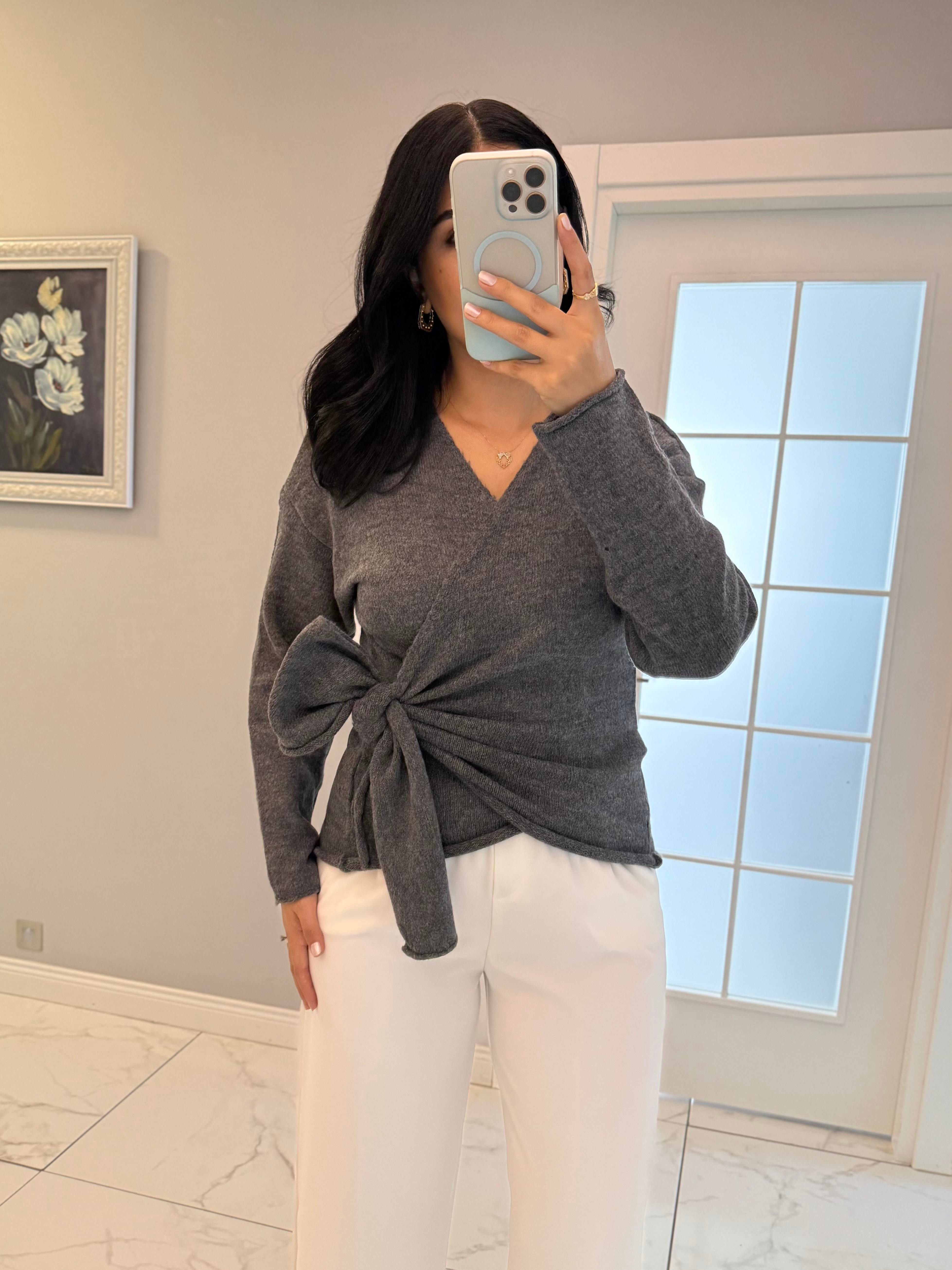 Antrasit Kruvaze Bağlama Detaylı Triko Kazak